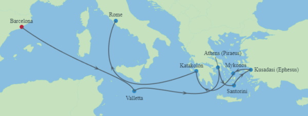 | 출발지 | 바르셀로나, 스페인 | 도착지 | 로마(치비타베키아), 이탈리아 |