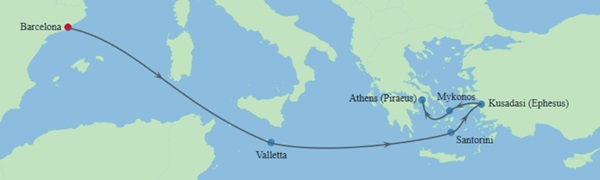 | 출발지 | 바르셀로나, 스페인 | 도착지 | 아테네(피레우스), 그리스 |